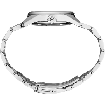 The case and bracelet incorporate many flat surfaces that have a modern sharpness that allows the watch to shine and sparkle from every angle. The case has a super-hard coating that protects the case and bracelet from scratches but also endows it with a long-lasting brilliance. These are precisely engineered and polished surfaces and the crisp edges of its silhouette contrast with the subtle hairline finish to create a pleasingly multi-dimensional effect.