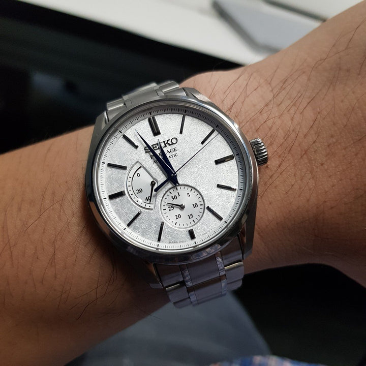 The Seiko Presage Automatic White "Baby GS Snowflake" Ref. SARW041 is the latest from the house of Seiko. Debut at Baselworld 2017 and one of the most anticipated Presage model from Seiko. It is a great balance between quality and price. Many call this the baby Grand Seiko Snowflake due to the high level of finishing to the case and bracelet. This is probably the closest you can get to a GS Snowflake without paying the GS price.
