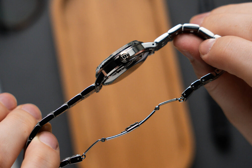 Each dial features a delicate pattern with a subtle gray gradient that becomes lighter towards the center. This design element, paired with gold-colored hands and indexes, beautifully mirrors Tokyo's evening lights and its stunning skyline filled with high-rise buildings. The intricate detailing on the dials reflects the vibrant and sophisticated night view of Tokyo, much like Kishi’s cocktail in a glass.